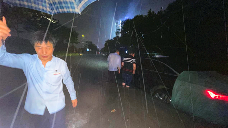 7月20日當晚,面對暴雨汛情突發,美盛物業迅速集結各項目工作人員成立應急小組,全員24小時堅守在一線救災抗災。當日22點,物業服務中心接到業戶求助電話,車輛涉水拋錨美盛中心外1公里處,情況緊急。美盛物業項目負責人迅速集結秩序經理、消防主管、中心工程經理等趕往現場,以最短時間到達業主身邊,幫業戶推車至安全地區。