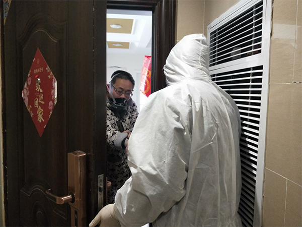 身著防護(hù)服開展入戶測溫工作