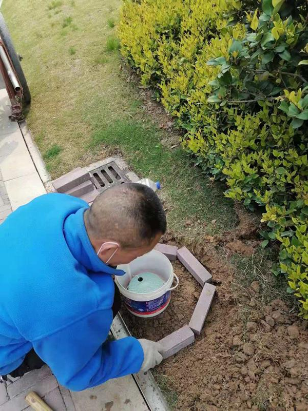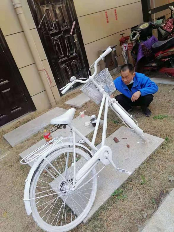 在項(xiàng)目確定方案后,王建功大哥主動(dòng)請(qǐng)纓,為我們提升措施貢獻(xiàn)自己的一份力量。他積極收集相關(guān)的材料,為自行車刷漆,協(xié)助環(huán)境主管對(duì)自行車安裝裝飾花卉,并截取鋼筋對(duì)景觀的自行車進(jìn)行固定;園區(qū)的綠化取水口處,針對(duì)不同的取水口位置,對(duì)取水口周邊灌注水泥,并在周邊增加磚塊造型;小區(qū)南門涌泉的水泥地面,則先在周邊鋪設(shè)磚塊,擋住泥土,然后用水泥將地面鋪平,再刷上綠漆。